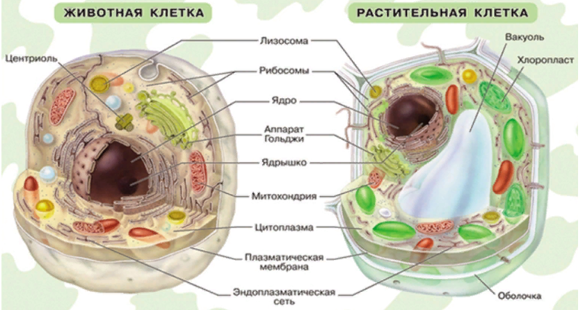 Клетки растений имеют некоторое отличие от клеток животных, могут иметь различную форму — овал, круг, цилиндр, призма. Их основные составляющие называются органоидами: вакуоль, пластиды, клеточная стенка, которых нет в животных клетках.