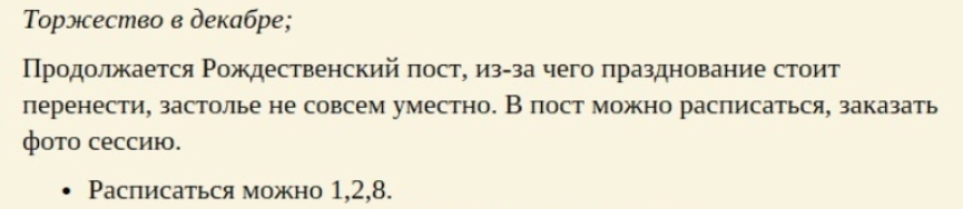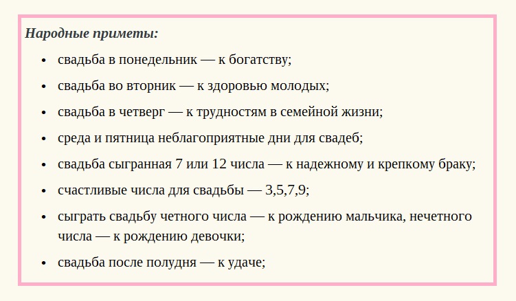 Самыми благоприятными днями для заключения брака считают пятничный и воскресный день.