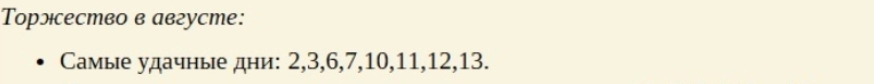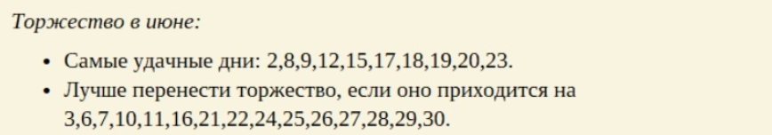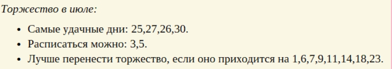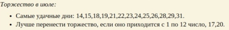 Рост Луны благоприятен для проведения торжеств, он начинается с 5 и продолжится до 19 июля включительно. Период с 12 июля по завершению влияния Меркурия и до конца месяца самый удачный. Он благоприятствует всему новому, в том числе и зарождению семьи, убирает с пути супругов всевозможные споры, неурядицы.