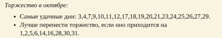 • Октябрьская свадьба сулит супругам много испытаний. Месяц довольно коварен. Но если любовь взаимная, они все преодолеют и будут счастливы. При холодном расчете супругам светит бедность, мытарства.