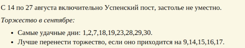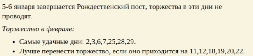Свадьба очень важное мероприятие. Ее тщательно планируют, серьезно подходят к выбору даты торжества. Не подходящая день может разрушить все то, что строилось молодой парой определенное время. Бывает так, что уже все запланировано, а молодых всячески отговаривают, умоляют перенести дату. Ведь часто семейное счастье будущих супругов зависит не только от них самих. Молодоженам нужно понимать, что не все дни благоприятные для проведения торжества.