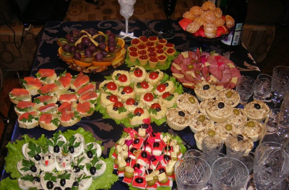 В качестве закуски готовят нарезку из колбасы, сыра, фруктов. Также сюда можно отнести конфеты, канапе рулетики на шпажках, тарталетки, бутерброды на багетах с икрой, красной рыбой, мини-пиццы. Салаты и горячие блюда будут подаваться на основном свадебном столе после росписи, поэтому не стоит заранее нагружать гостей. Это должны быть такие закуски, к которым не требуются столовые приборы, после них не должны пачкаться руки, дабы гости не бегали в поисках мыла и полотенца.