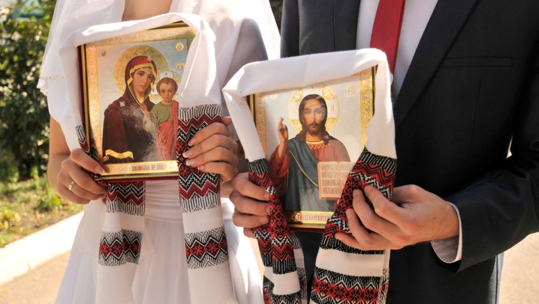 Совершать благословение нужно с помощью икон. Родители невесты благословляют молодых иконой Божьей Матери, а родители жениха Иконой с ликом Иисуса Христа. Иконы при этом должны быть обернуты в рушник — такие полотенца обычно продаются в свадебных магазинах или церковных лавках. По традиции, во время благословения иконы не берутся руками.