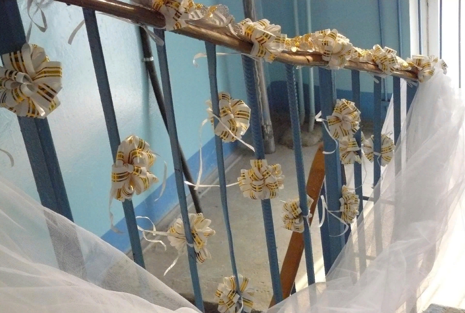 - Развесить преграждающие ленты от перила до стены. Лент долно быть 7-10 штук. На каждую ленточку жених будет придумывать комплименты для любимой;