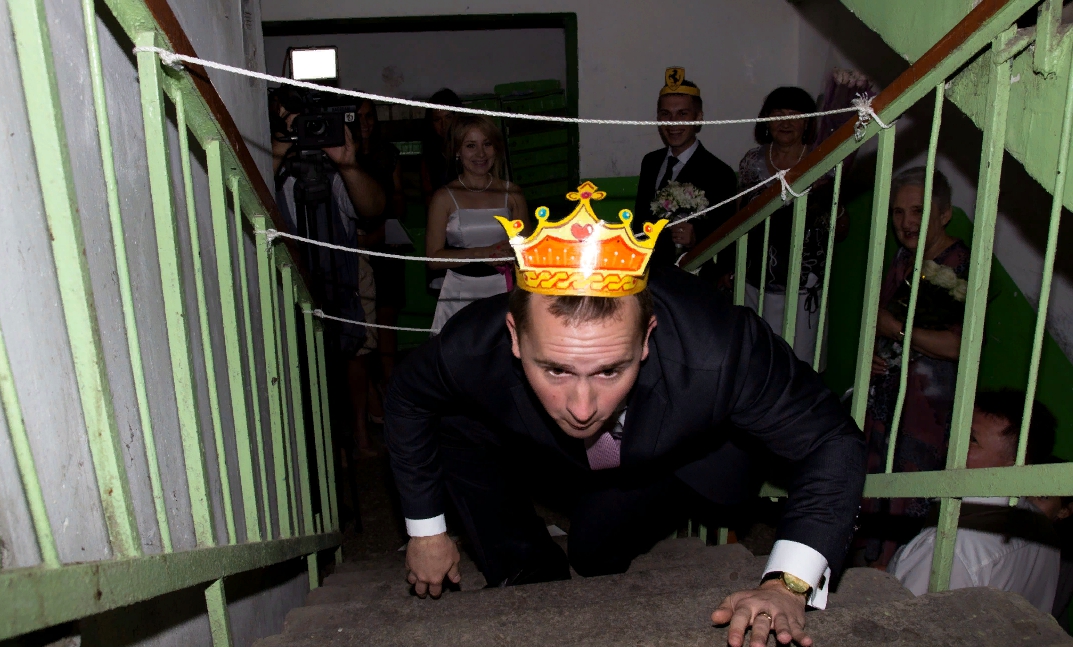 По мере выполнения конкурса свита жениха движется все ближе и ближе к невесте. Но невеста у нас девушка непростая, сегодня она — королева. Ее подружки просят жениха надеть корону и пройти следующий конкурс. На лестничном пролете заранее привязываются ленточки на высоте 1 м. Наш король должен проползти под ними и и только после этого заполучить свою возлюбленную.