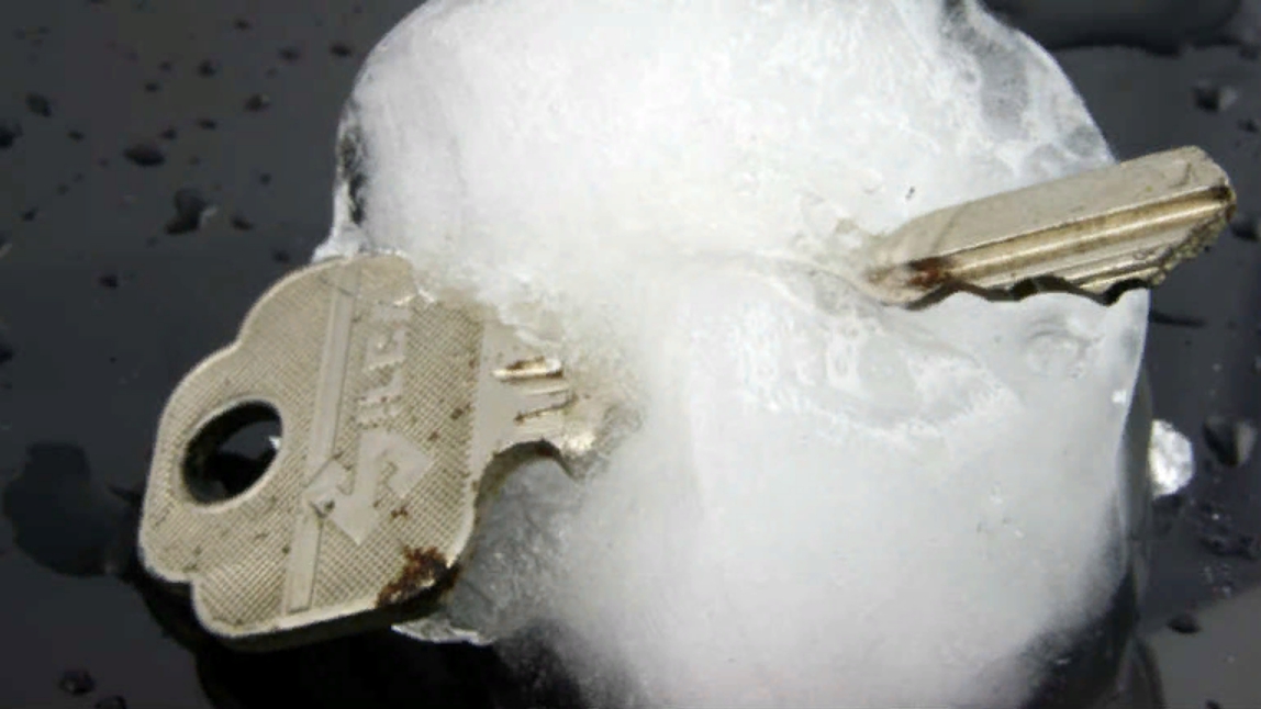 Третий конкурс. Выполняется прямо перед дверью в квартиру или дом. Сейчас поймете почему. Для состязания нужно взять несколько ключей. Одним из них должен быть ключ от закрытой двери. Ключи кладутся в стакан и заливаются водой. Стакан с водой нужно заморозить. Жениху, чтобы получить невесту нужно не более чем за 2 минуты добыть нужный экземпляр. Иначе придётся откупаться.