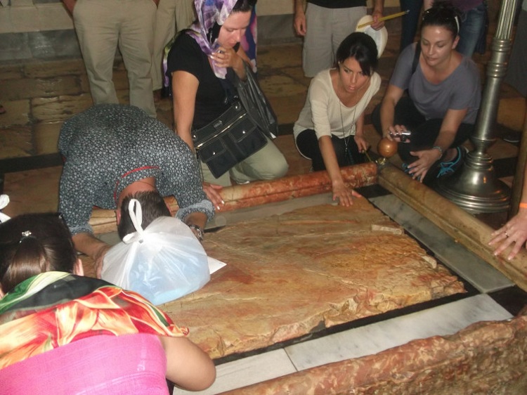 Преподнесение лампад исходило от русских купцов. Они были подарком Храму. Возле камня выложено полотно из мозаики, а на доске из мрамора выгравировано текст из Евангелия. Многие молят о прощении грехов, даровании благодати, здоровья. У каждого верующего свои прошения. Воссоединяют их молитвы и хвала воздаваемые Христу. Все вещи, которые были приложены к плите, становятся освященными.