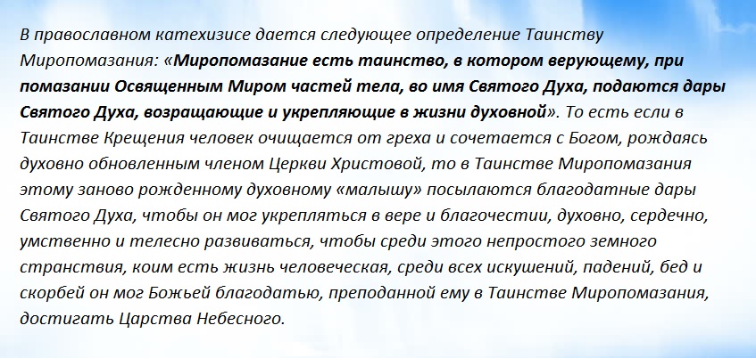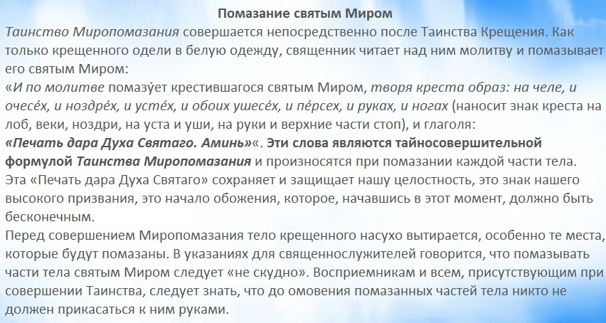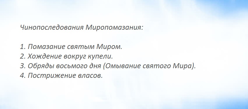 Без миропомазания обряд крещения не имеет своей завершенности, кульминации. Именно помазание укрепляет начатое дело, в нашем случае веру. Снисхождение Святого Духа происходило через возложение рук апостолов. Позже к этому действу присоединили помазание с произношением значимых слов.