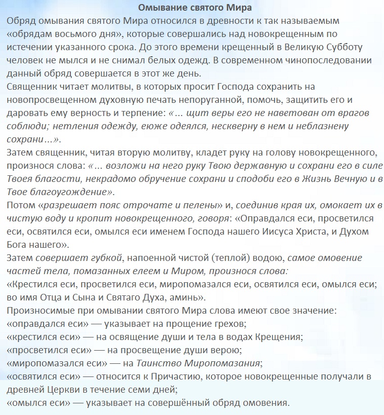 Священники по этому поводу говорят, что это все глупости. На обряд вы должны взять с собой салфетки, которыми можно вытирать текущее Миро, если вы взрослый человек. Салфетки остаются в церкви, их впоследствии сжигают. После обряда происходит умывание мест помазанных Миром. Кроме этого масло имеет свойство быстро впитываться, из-за чего смыть его уже просто нет возможности. Оно в вас!