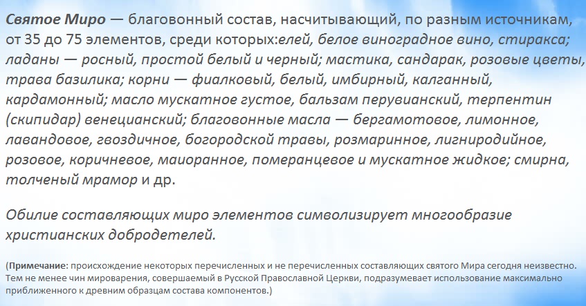 В РФ Миро освящает Патриархом Московским. Затем его отправляют по приходам для проведения Миропомазания.