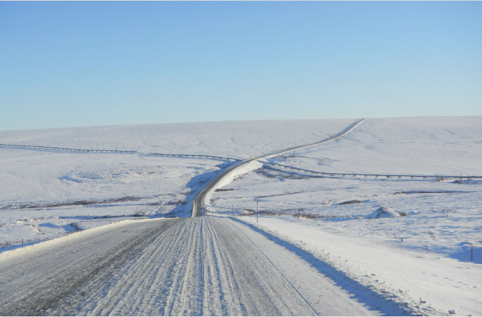 Дорога на Аляске, протяжённостью 666 километров, имеет на своем пути всего три населенных пункта. Идет через Полярный круг и заканчивается в зоне вечной мерзлоты. Часть дороги асфальтирована (175 км), остальную часть машины едут по гравию, который зимой покрыт коркой льда. Для въезда необходимо иметь все необходимое для выживания.