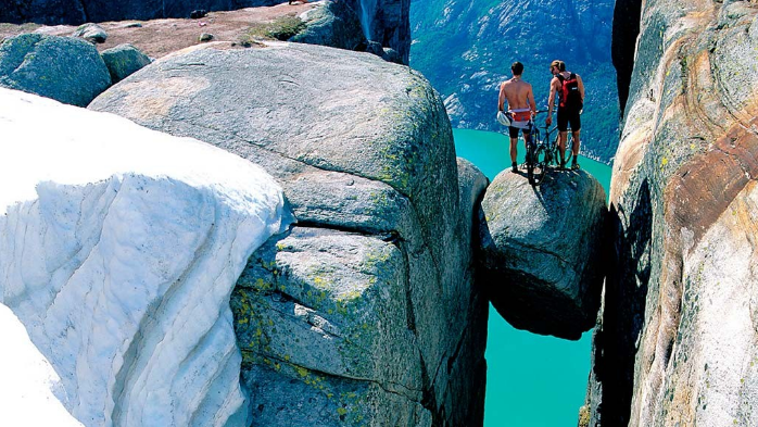 Камень, самый опасный в мире, висит между скалами Люсе-фьорда в Норвегии. Как он сюда попал, никто не знает. Высота над фьордом — около 1 километра. Не смотря на опасность упасть в пропасть, туристы считают своим долгом сделать фото.