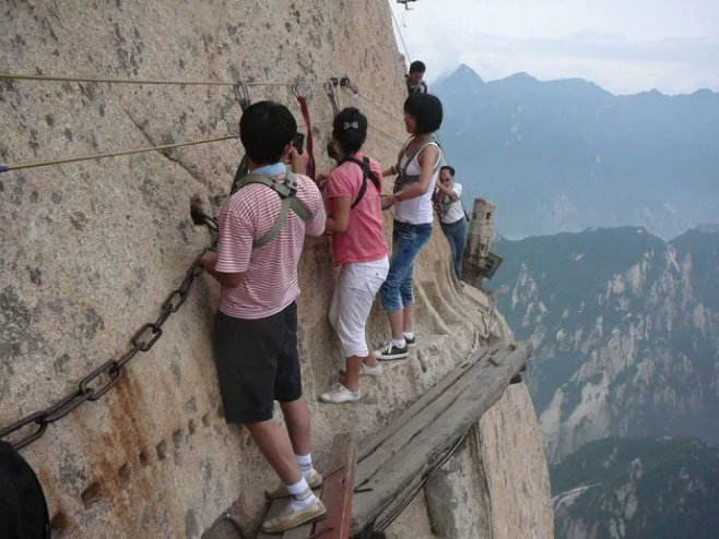 Тропа смерти — так называют восхождение к вершине горы Хуашань. Тропа сделана из досок над краем пропасти. Сюда приезжают тысячи туристов испытать судьбу. Ежегодно здесь погибают 100 человек. Укрепления сделаны для туристов, ранее это просто была дорога из дощечек.