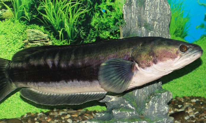Свое название рыба заслужила из-за формы головы, похожей на змеиную. Эта хитрая и прожорливая рыбка подстерегает свою жертву из засады. Вес — 20 кг, длина — 1,3 метра. Обитает в пресных водоемах Малайзии, Вьетнама, Лаоса, Индии.
