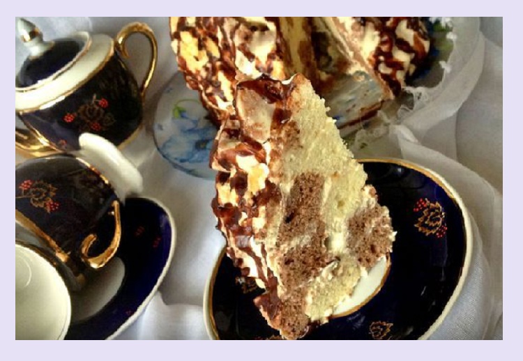 Если нет времени возиться с коржами, можно выпечь один хитрый. Для этого бисквитную массу выкладывают ложкой в шахматном порядке. В итоге, выходит шоколадно-белый бисквит. После выпекания, корж нарезается как и обычный.