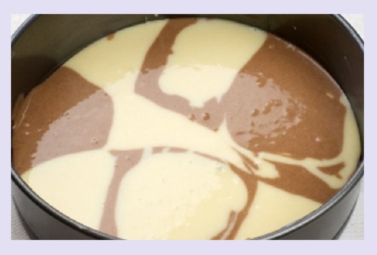 - Теперь, делаем разделение бисквитной массы. Первую часть выкладываем в форму для выпекания. В оставшуюся вводим какао, затем перекладываем массу в такую же форму.