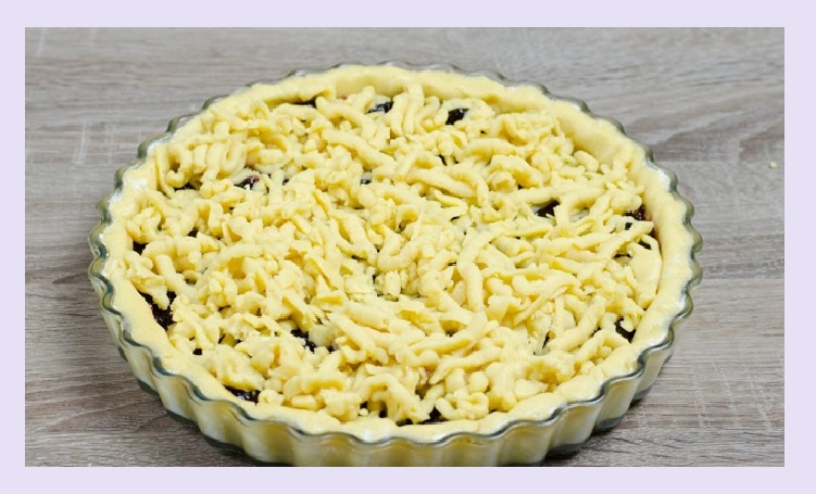 - Аккуратно натираем примерзшее тесто. Оно должно полностью накрыть начинку.