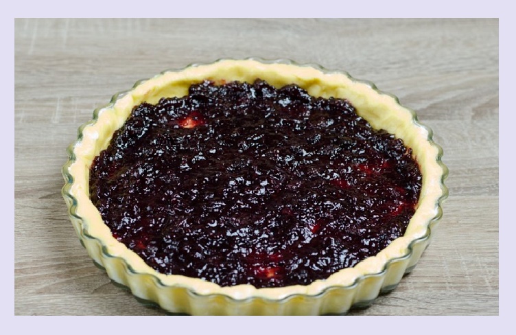 - Первую часть необходимо распластать в форме или деке для выпекания. Следом нанести варенье.