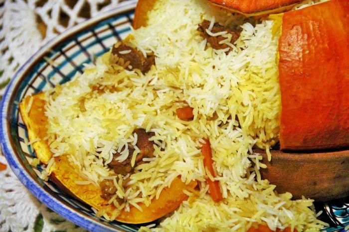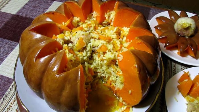 Плов является традиционным и любимым блюдом в странах Востока. Вареный рассыпчатый рис с мясом завоевал признание и европейских жителей. Многие уже не представляют свои застолья без сытного кулинарного «изыска» и адаптируют рецепты приготовления плова по своему вкусу. Предлагаем зафаршировать тыкву рисом с курицей и приготовить один из вариантов плова.