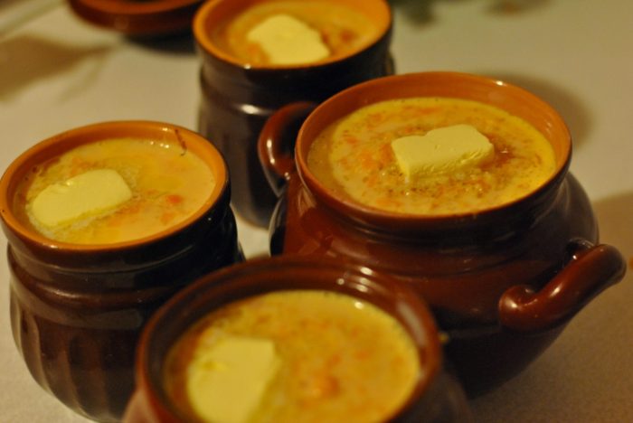 - На поверхность выкладывают кусочек сливочного масла. Горшочек хорошенько закрывают фольгой и ставят в духовку, нагретую до 180°. Через полчаса снижают температуру до 150° и продолжают томить кашу еще 30 минут. Затем духовку выключают и выдерживают кашу 30-40 минут, не вынимая из духовки.