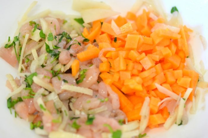 - 100 г тыквы натирают на терке, предварительно срезав толстую кожуру и отправляют в мясной фарш.