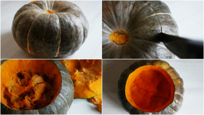 - Тыкву моют, разрезают пополам и удаляют внутренности: семена с мякотью.