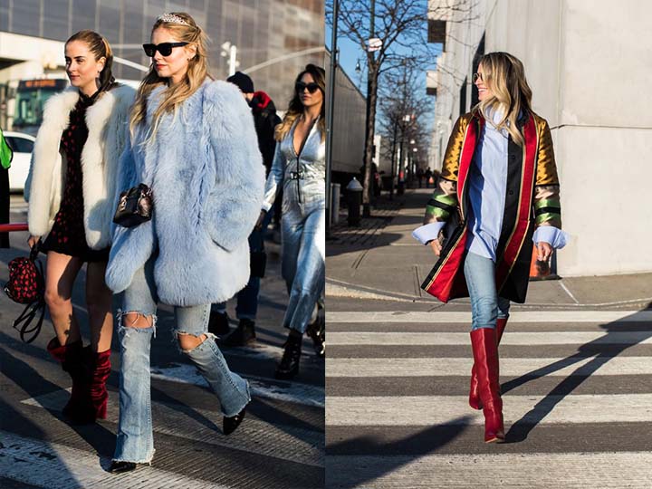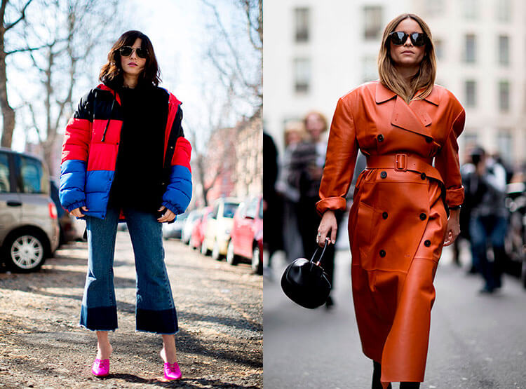 Кожаная и замшевая одежда (куртки, жакеты, плащи) — вечный тренд уличной моды. В равной степени уместными в женских образах стрит стайл будут традиционные черный и коричневый, а также смелые насыщенные цветовые решения: все оттенки ярко-красного, травянисто-лимонного, кораллового и фуксии.