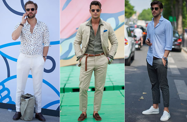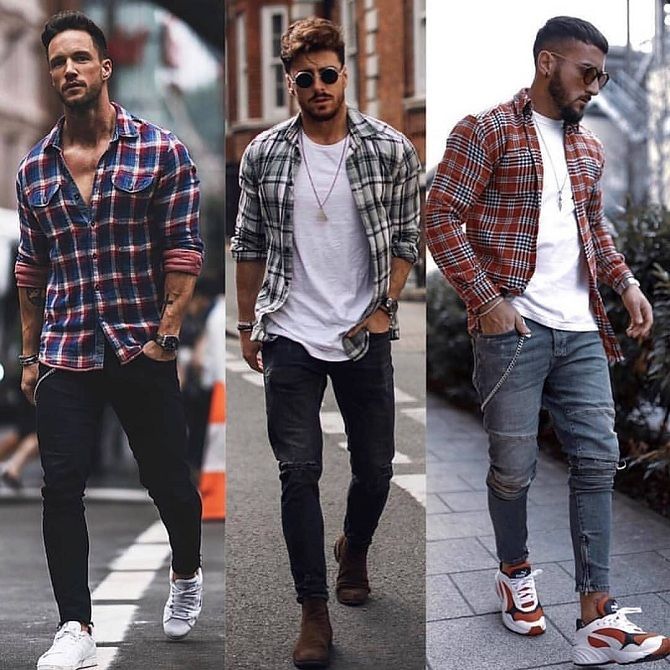 Брюки или джинсы с «рваным» дизайном в образах street style лучше всего сочетаются с классическими рубашками и футболками без какого бы то ни было дополнительного декора. В комплект к модным мужским брюкам кэжуал есть смысл подобрать более броский, привлекающий внимание верх.