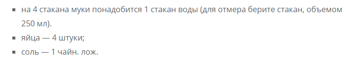 Чтобы тесто получилось удачным, необходимо соблюдать все пропорции. Боитесь ошибиться? Тогда берите 600 грамм муки и 280 мл жидкости (вода, масло — все вместе). Если яйца у вас мелкие, недостающую жидкость можно компенсировать с помощью воды.