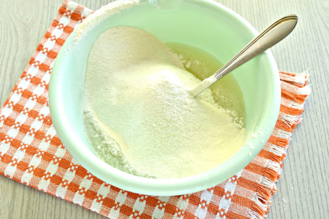 В кефир всыпать соль и соду, добавить яйцо. Перемешать все до однородной массы. Просеянную муку вводим частями и перемешиваем руками на столе.