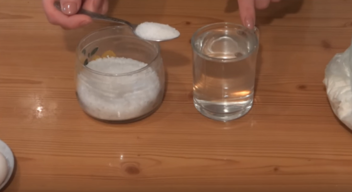 В стакан с теплой водой добавляем соль и перемешиваем таким образом, чтобы она растворилась.