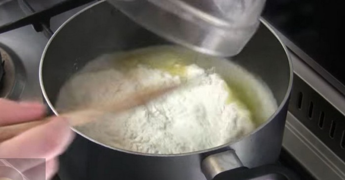 Далее всыпайте муку (160 грамм) и интенсивно перемешивайте. Держите на огне не более двух минут.