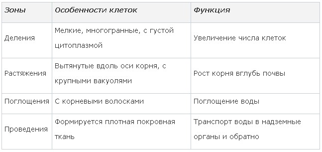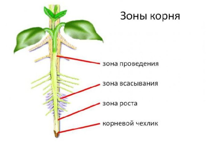 Разные участки корня имеют различное строение и, соответственно, разные функции. Такие участки называют зонами проведения, поглощения, роста, деления.