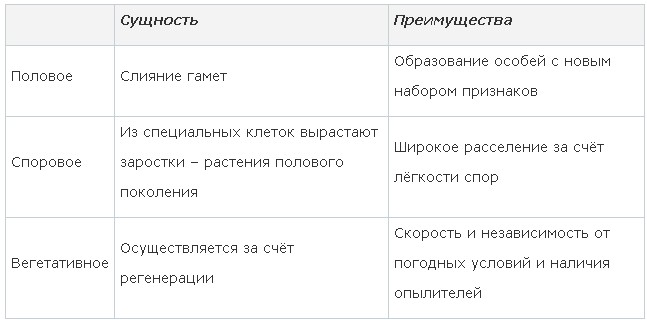 В таблице можно посмотреть и сравнить разные способы размножения растений
