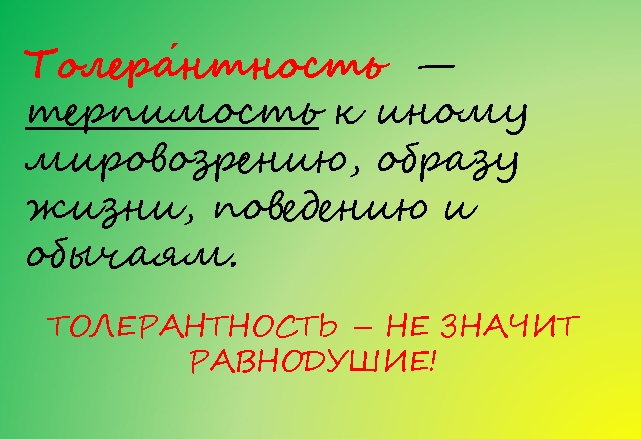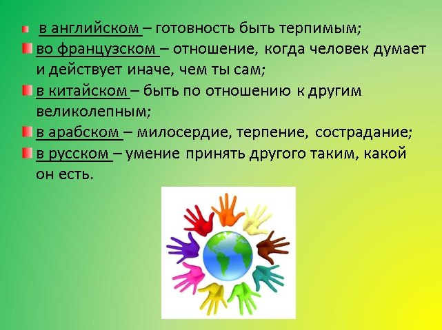 Как вы думаете, стоит ли таким словом называть людей с ограниченными возможностями? До нашего урока я просила вас ответить на несколько вопросов, один из них — что означает слово «толерантность»? Многие из вас знают ответ на этот вопрос.
