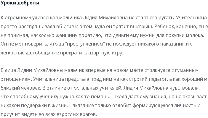 Уроки доброты необычные, они не требуют определенных знаний в области наук. Главная цель, которую ставит учитель, это научить ребят открывать свое сердце доброте, развить собственную самооценку, побудить совершать хорошие поступки.