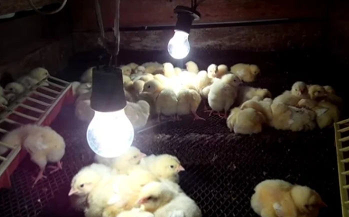 Для цыплят, которые только доставлены на постоянное место «проживания» необходима температура в пределах +24+25 гр. Под брудером (источник обогрева) и все +33, спустя неделю ее снижают на три градуса, еще через семь дней доводят до +22, а на четвертой недели до +20. Необходимо учитывать, что бройлеры мало двигаются и в большом помещении тратят много сил на поиски наиболее теплого места. Поэтому пространство ограничивают и оборудуют обогреватели — инфракрасные лампы или электрогрелки. Освещение чередуют каждые два часа — светлое и темное. Такие условия способствуют быстрому набору веса при минимальных затратах на корм.
