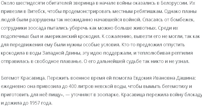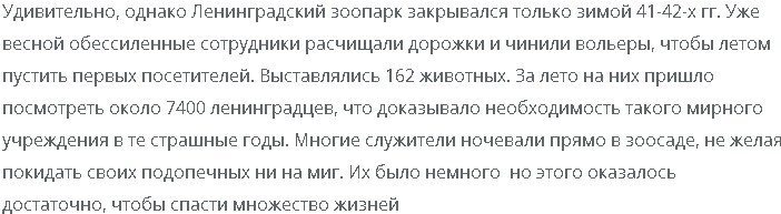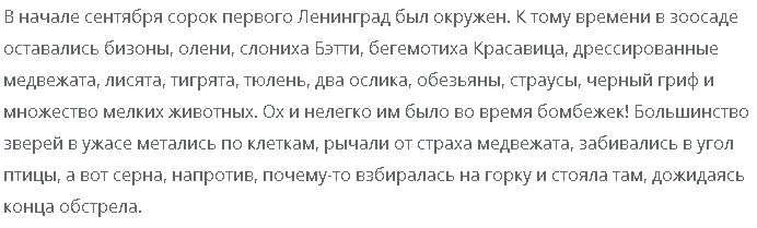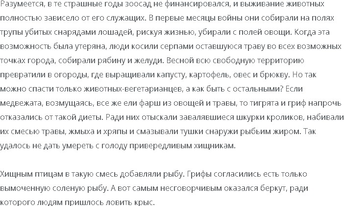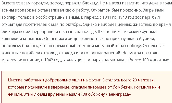 В Санкт-Петербурге впервые появился частный зоопарк в 1865 году, его коллекция составляла 200 видов животных. В 1917 году зоопарк стал собственностью государства во главе с ученым советом. В начале ВОВ многие животные были эвакуированы, но не все. Благодаря работникам, во время блокады, часть питомцев удалось спасти.