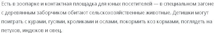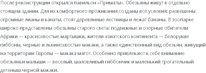 Не смотря на то, что парк занимает небольшую территорию, он является одним из лучших в стране. Открыт в 2008 году, входит в первую пятерку по посещаемости в России. Животным здесь постарались создать условия, которые максимально приближены к их естественной среде обитания. Ежегодно численность питомцев пополняется, на сегодняшний день в зоопарке насчитывается 231 вид и 700 особей.