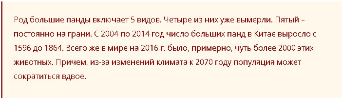 Все большие панды, которые сегодня есть в зоопарках мира являются собственностью Китая. Так как в этой стране они являются национальным сокровищем, за их убийство предусмотрена смертная казнь. От европейцев их скрывали до окончания 19-го века. Эти животные довольно парадоксальны, ученые долго не могли определиться к какому виду их отнести — к енотам или медведям. В результате пришли к единому мнению, что это, все-таки, медведи.