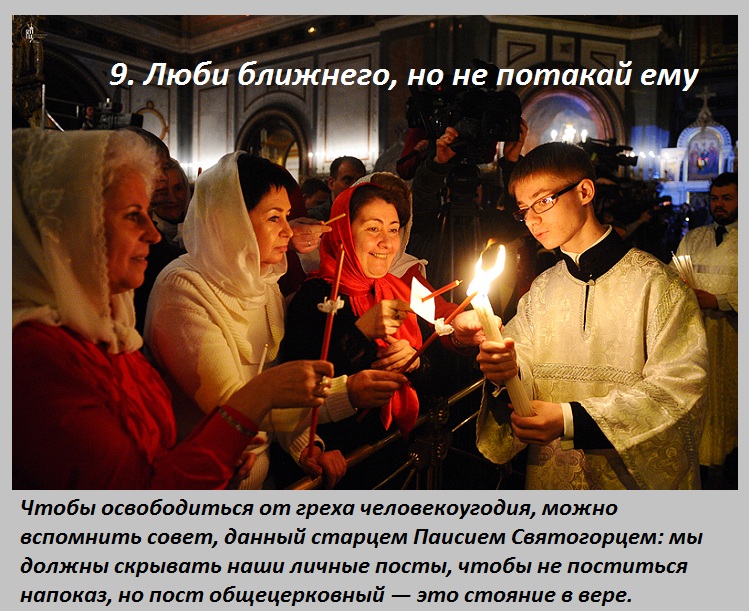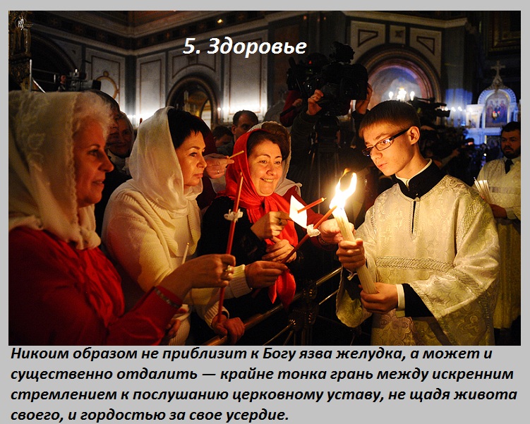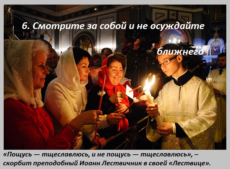 Каждый человек должен приступать к посту, после беседы с батюшкой, уточнения с ним списка разрешенных продуктов. Не уподобляйтесь мытарям и фарисеям. Не нужно выставлять себя на показ, «Он дома молится» — «А я в церковь иду», «Он строго постится» — «А я поклоны в церкви бью».