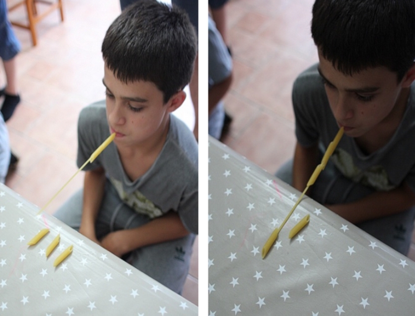 Используя длинные спагетти (сырые), игроки должны без рук нанизать на них по 5 полых макарон и заработать очки.