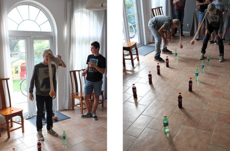 В этом конкурсе участникам выдают по 6 железных ложек. Они должны с помощью одной из ложек забросить другие в миску или банку.