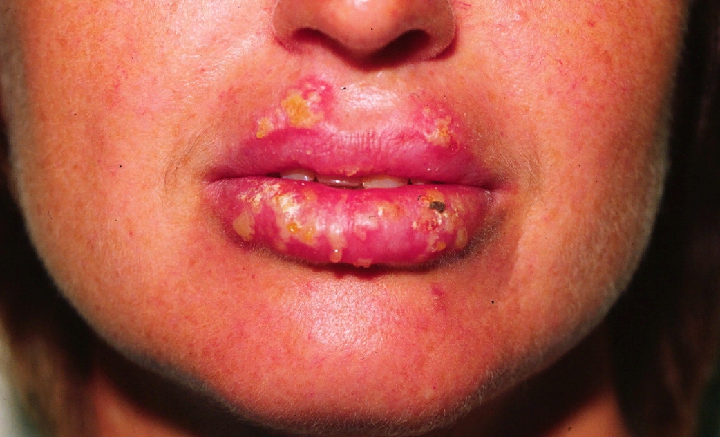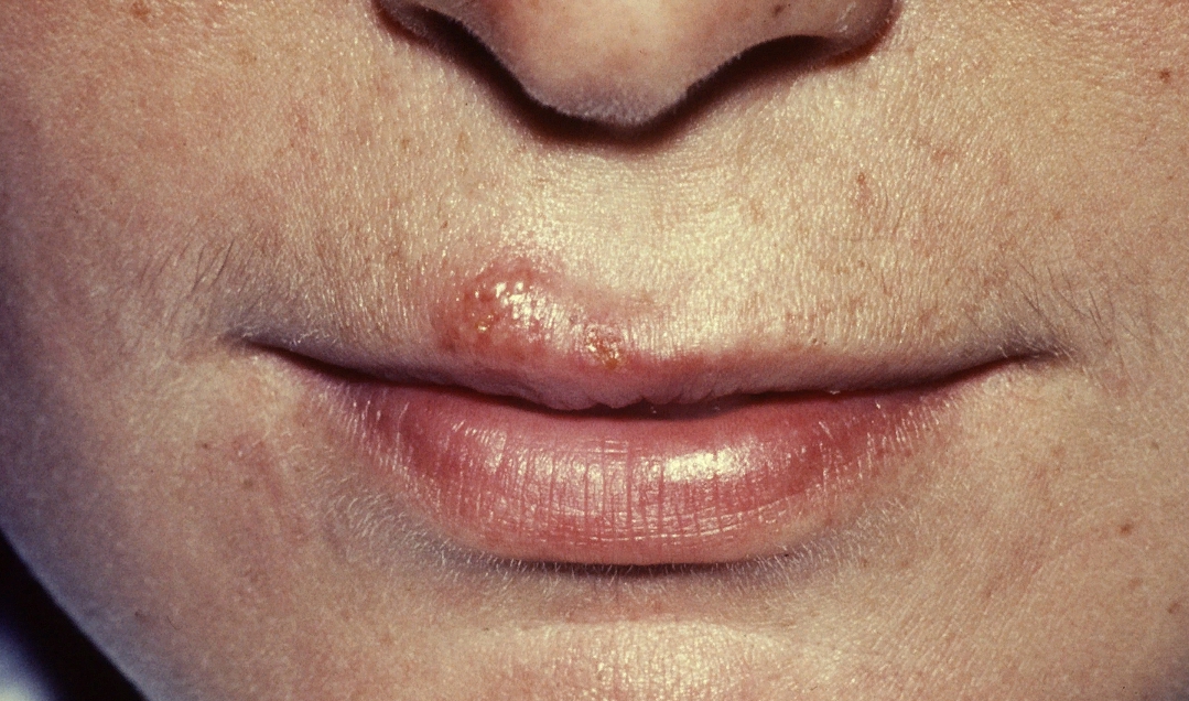 - Первый тип вируса герпеса человека – в основном проявляется на губах. Формируется за 2-3 дня в виде набухающих прозрачных пузырьков. Ощущается с момента зарождения глубоко под кожей, начинает чесаться, краснеть. Кожа постепенно краснеет и на поверхности проявляются прозрачные гранулы, которые со временем лопаются и засыхают. Этот тип герпеса считается самым простым;