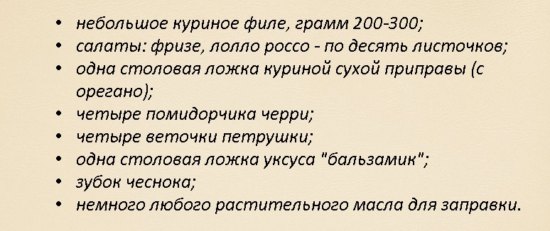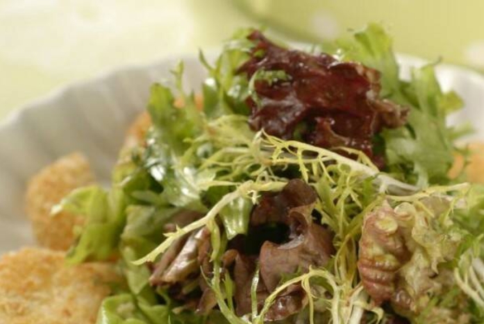 Сорта салатов, приведенные в рецепте, вы можете заменить по своему усмотрению. Но, по мнению опытных хозяек, латук, корн и фризе, сочетаются как нельзя лучше.