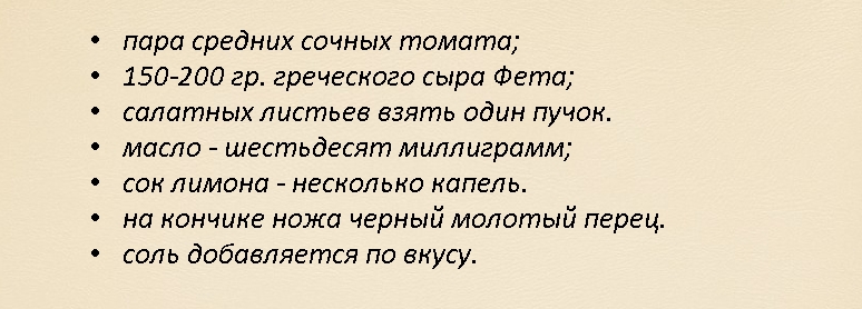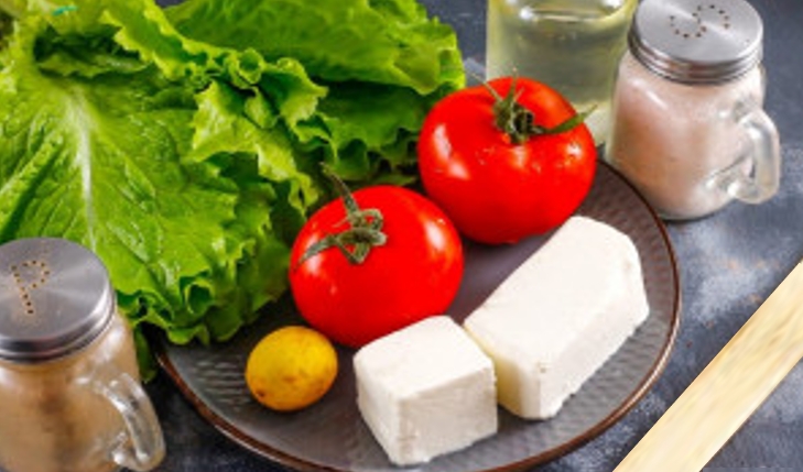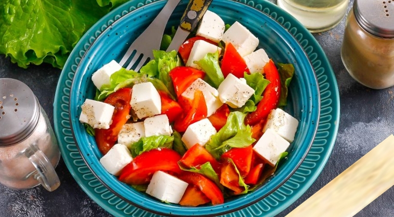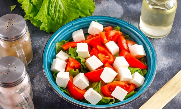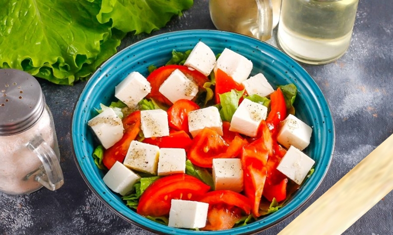 • Нарезать фету на кубики, добавить к помидорам и салату.