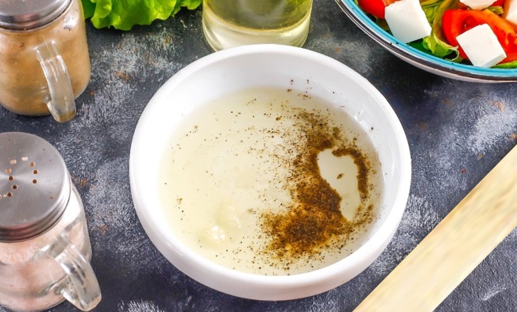 • В отдельную емкость выжать сок из лимона, к нему влить масло и приправить солью и перцем.