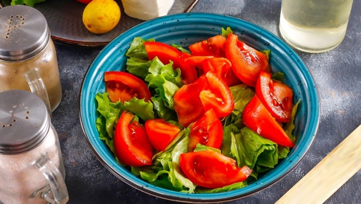 • Промытые помидорки нарезать на ломтики и положить сверху на зеленые листья салата.