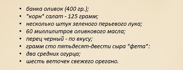 3. Смешать вышеперечисленные компоненты, положить к ним кукурузу и оливки.