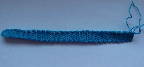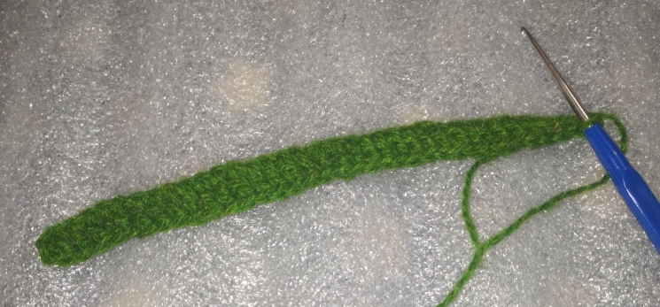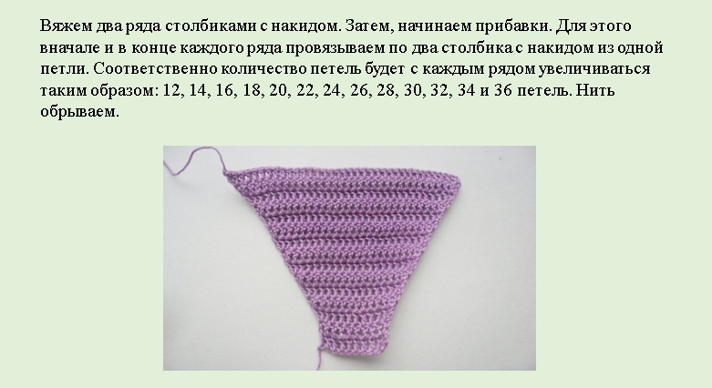 Среднюю часть вязать столб. с нак., в нашем варианте — всего шесть рядов, после чего последняя петля закрывается, нить обрывается.